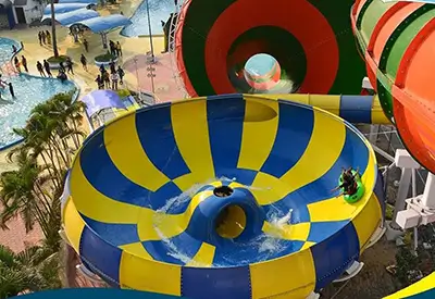 “Tornado Funnel” is a cone-shaped dia of 40ft. in which two riders at a time slide down on a raft entering through a tunnel length of 260ft. from a tower height of 40ft. with a momentary zero-gravity experience. The centrifugal forces keep the riders high on the wall for several turns and after a series of exciting oscillations through the funnel, they descend into a closed tunnel and splash into a pool of crystal clear water.